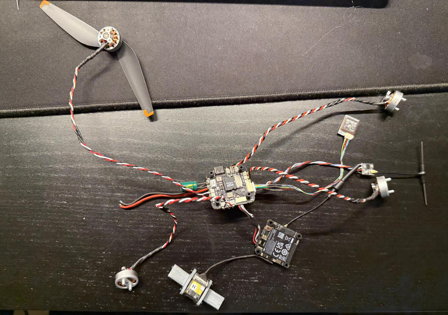 The frame consists of a lightweight foaming PLA body, two perpendicular carbon tubes through the arms, and four smaller carbon rods to reduce torsional vibrations. As well as a soft TPU base for landing durability.The takeoff weight of the drone is 284.5 grams. Slightly over the 250-gram goal.