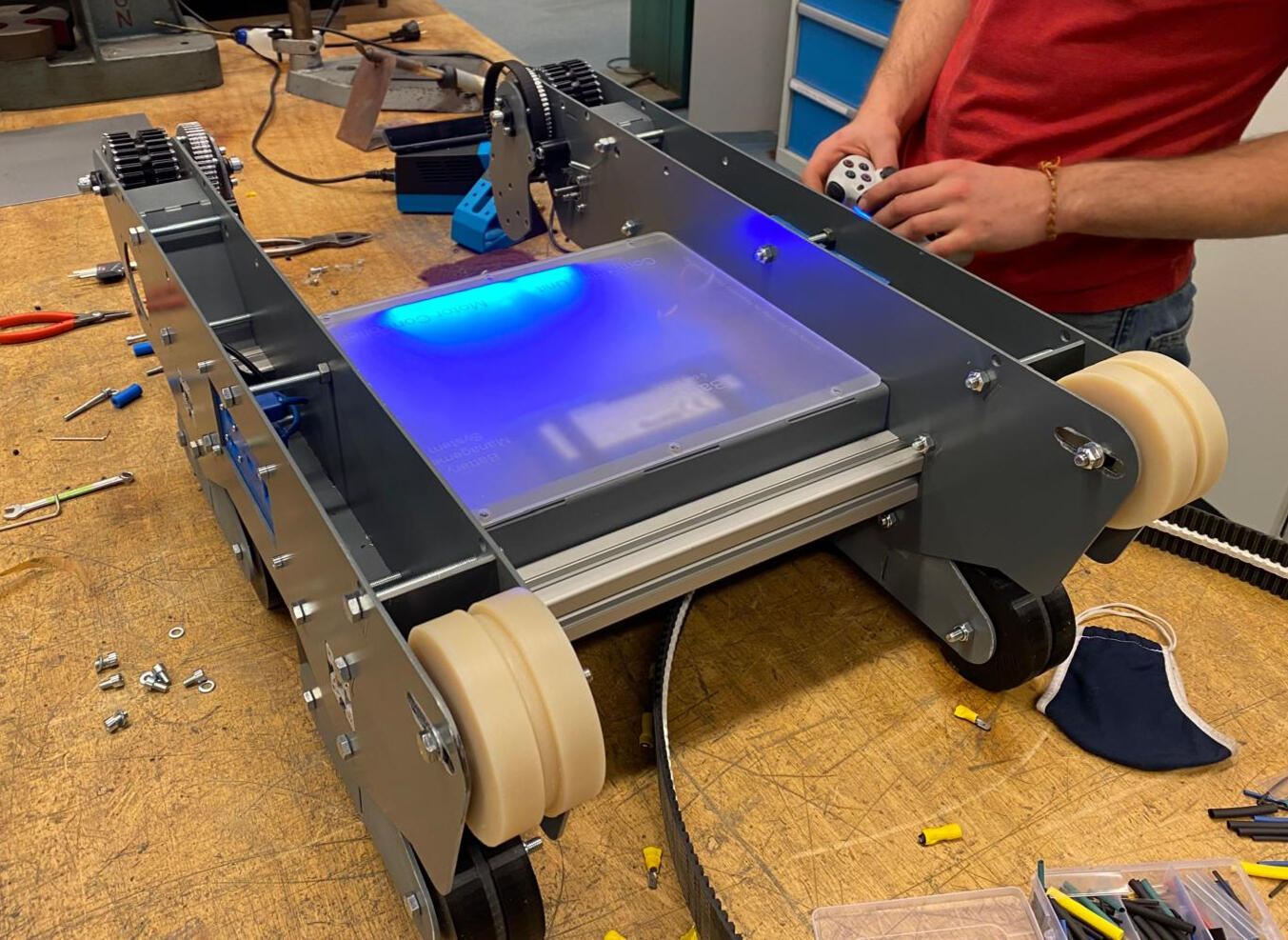 The goal of the UGV was to create a research platform for autonomous tracked vehicles. Together with a friend, we designed and built the prototype using university workshops.The UGV was first conceived in NX. Throughout the design process, we made sure to focus on DFMA. As our manufacturing options at the university were limited.To make it easy to demo, we utilized a PS4 game controller and LEDs to indicate its state.This project was completed within one academic quarter.