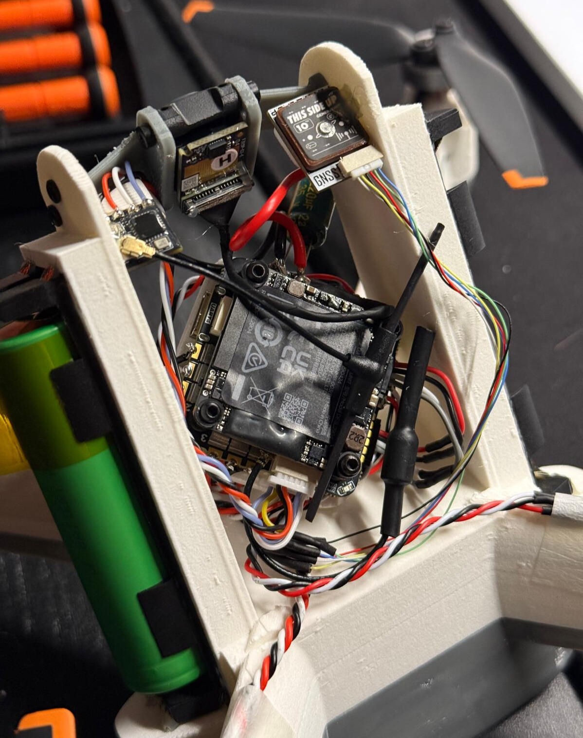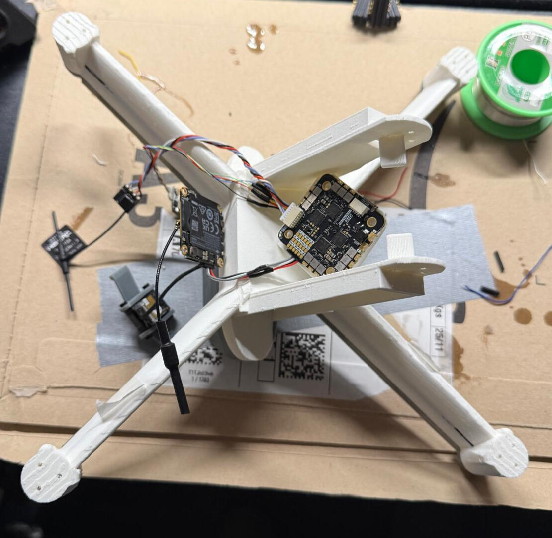 The frame consists of a lightweight foaming PLA body, two perpendicular carbon tubes through the arms, and four smaller carbon rods to reduce torsional vibrations. As well as a soft TPU base for landing durability.The takeoff weight of the drone is 284.5 grams. Slightly over the 250-gram goal.