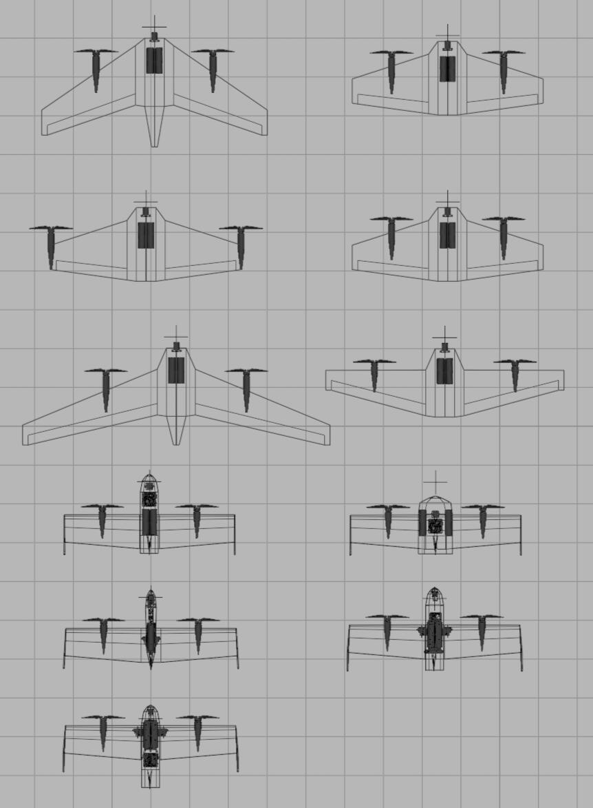 Generic fpv drones like the one seen in the CFD simulation above are not optimised for level forward flight. Rough simulation results suggest that at 60 km/h the generic drone produces 40 grams force of downforce and 80 grams force of drag. This can be improved.Constraints and requirements were set, and an initial parts list was made. Based on this, I ideated various layouts of flying wings and quads.