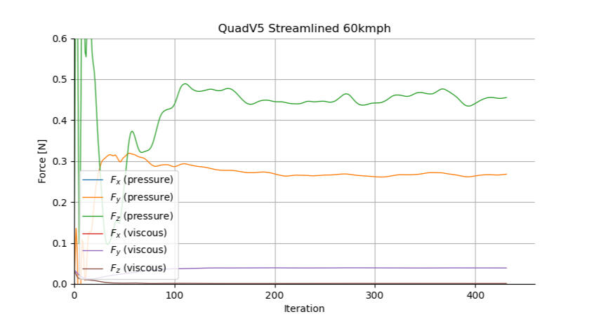 The new design (QuadV5) showed promising results with 94 grams force of lift and 55 grams force of drag at 60 km/h.But what does this mean? The generic drone roughly needs to produce 130 grams force more thrust than the streamlined design for the same speed.